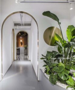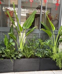 Bồn cây nhiệt đới với chuối kiểng làm điểm nhấn rất được yêu thích nhờ vẻ đẹp xanh mướt từ những chiếc lá và cảm giác xum xuê nhiều tầng của phong cách nhiệt đới.